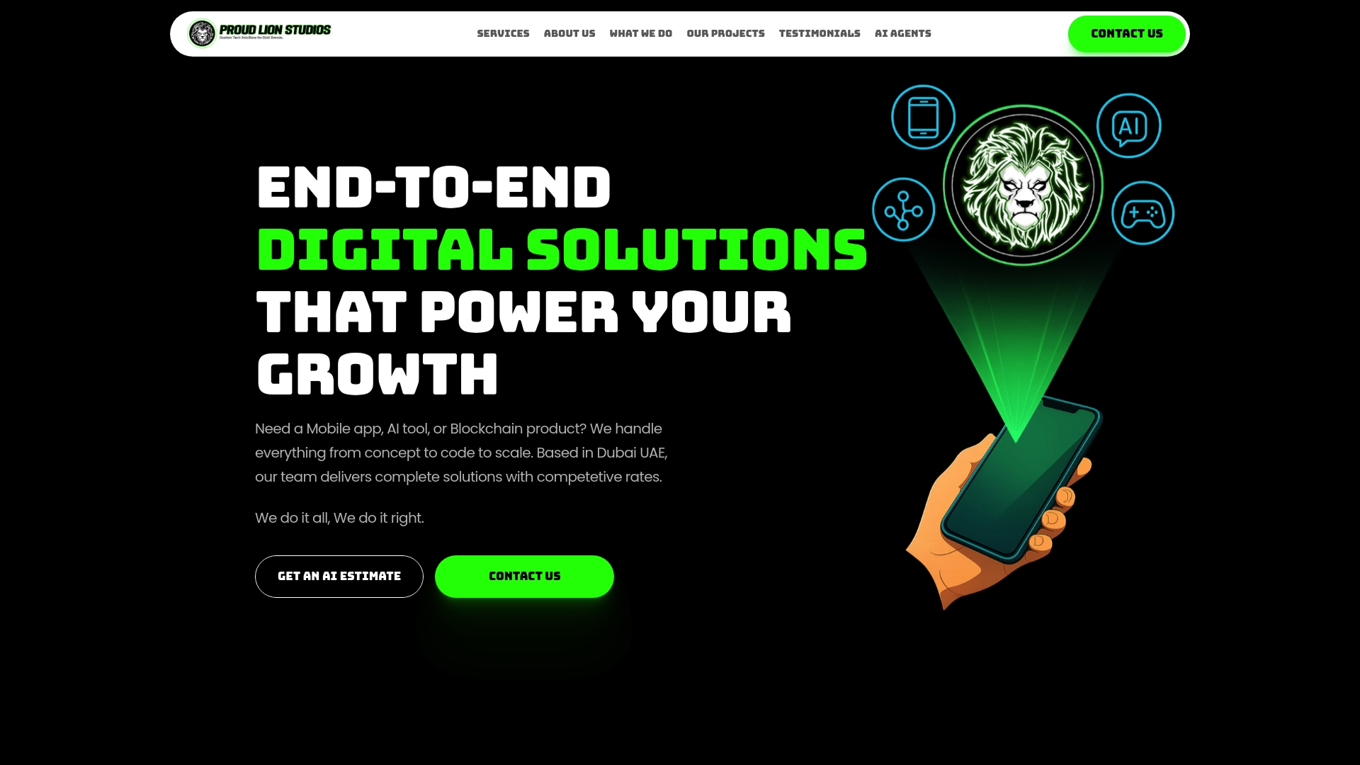 Proud Lion Studios provides complete end to end digital solutions including mobile app, AI tools, blockchain products, games, SaaS platforms, design, and animation. Their team handles concept, development, testing, and scaled deployment with a focus on business outcomes.